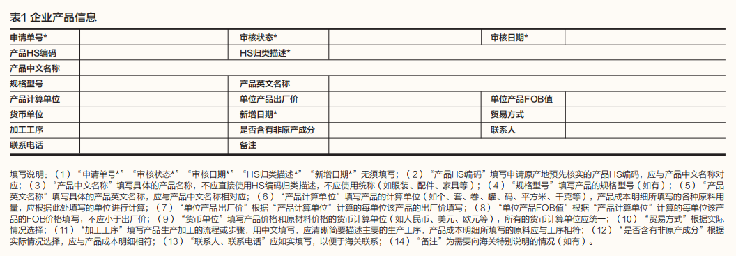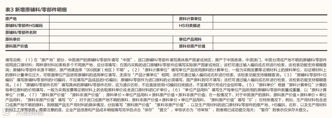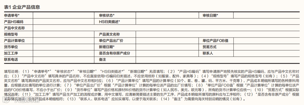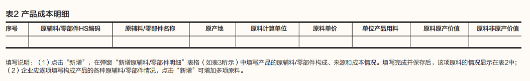 生产商登录 “原产地预先核实”模块 ,点击“新增”,进入详情页面,如实准确地填报产品的基本信息、生产加工过程中所使用的原材料、零部件,以及加工工序等信息。企业产品信息如表1所示,产品成本明细如表2所示,新增原辅料/零部件明细如表3所示。