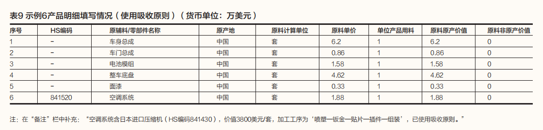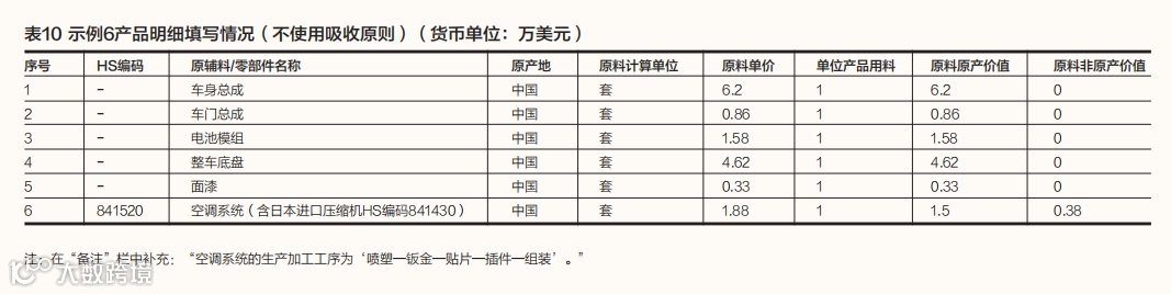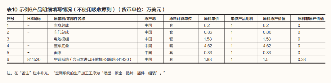 需要注意的是,电动巴士的生产用材料空调系统虽然为中国生产,但使用了日本原产的压缩机。由于不同的原产地规则对确定生产用材料的原产地或原产资格的结果不同,会影响最终产品原产地或原产资格的确定。为了便于根据不同的原产地规则正确确定货物的原产地或原产资格,即使使用吸收原则,也应尽可能将原材料中的非原产成分作详细备注,或者分别填写生产用材料中的原料原产价值和原料非原产价值,并填写进口原料的原产地、HS编码、名称、价格,以及生产用材料的加工工序。产品成本明细填写情况如表9和表10所示。