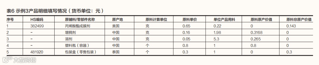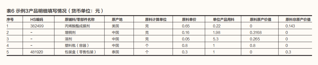 需要注意的是,塑料瓶及包装盒均属于与产品一并归类的零售包装和容器。在有的优惠原产地规则中,确定货物原产地时,如果货物适用区域价值成分标准,且其零售用包装材料及容器与货物一并归类,该零售用包装材料及容器的价格应按各自的原产资格纳入原产材料或者非原产材料的价格予以计算。为了便于根据不同的原产地规则正确确定货物的原产地或原产资格,生产商在填写产品成本明细时,如果产品包含零售包装及容器,需要在产品成本明细中如实填写,并作相应标注。纸箱则属于运输包装,不影响货物原产地的判定,因此无须在产品成本明细中填写。产品成本明细填写情况如表6所示。