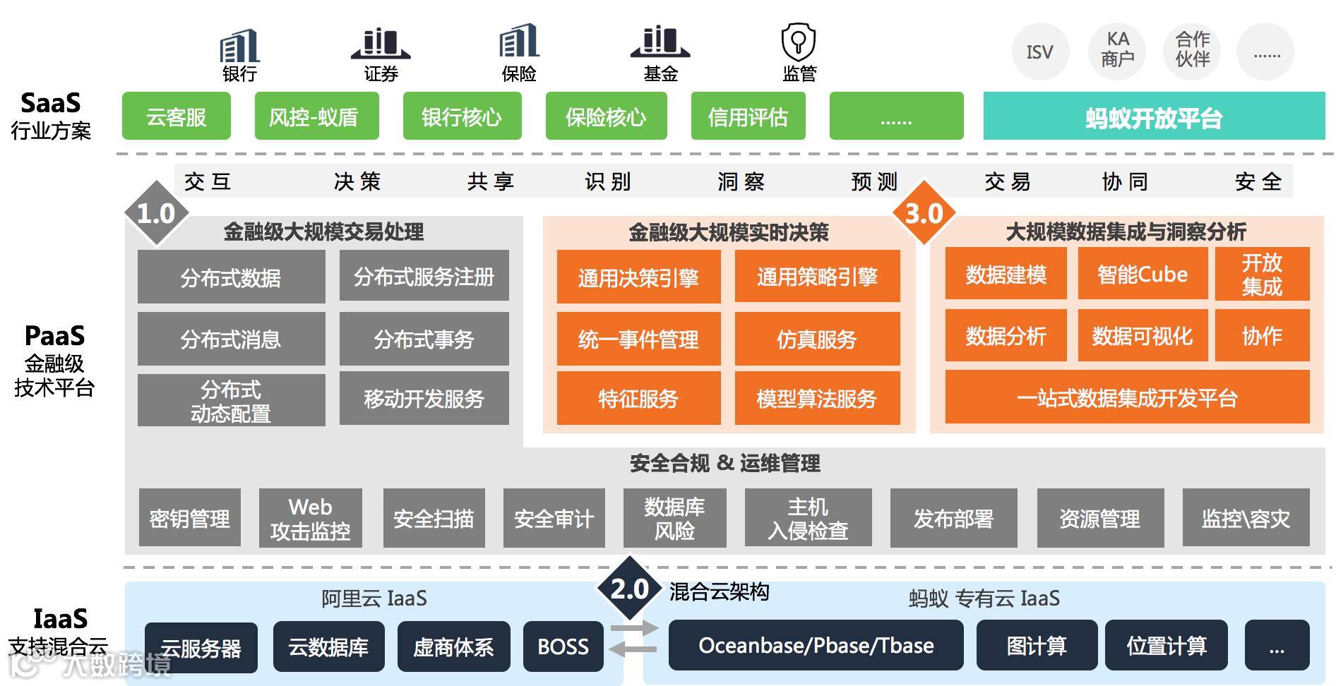 在云计算基础IaaS层、基础PaaS中间件层及产品层共同支撑下,蚂蚁金融云为金融行业的稳妥创新提供了所必要的、经过蚂蚁金服实际业务验证的技术能力:
