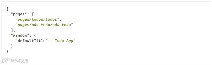 在这个示例中,我们有两个页面,Todo List 页面和 Add Todo 页面,他们都在 pages 目录下。小程序的所有页面路径必须写在 app.json 中,路径从项目根目录开始且不能包括后缀名,pages 的第一个页面就是小程序的首页。