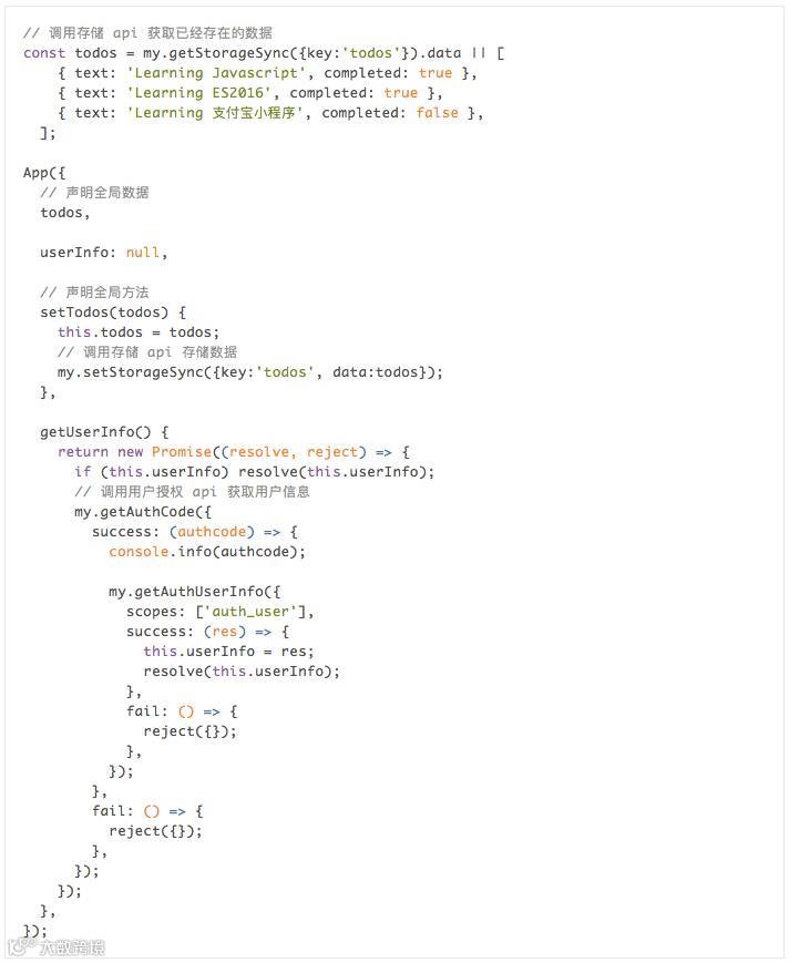 app.js 是小程序公共的逻辑脚本文件,在这个文件中可以监听小程序的生命周期,声明全局变量,调用框架提供的丰富 API,如以下所示的存储以及获取用户信息 API,更多 API 参见 API 文档(https://docs.alipay.com/mini/api)。