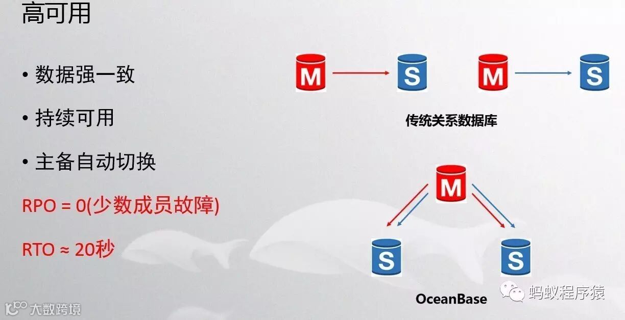 传统的关系数据库的主备架构,不管一主一备还是一主带多备,不管主备之间基于强同步的最大保护模式,还是基于弱同步的最大性能模式,主备之间任何一个节点发生故障的时候,系统要么选择停服务,要么选择忍受主备之间的数据可能不一致。对于关键业务来说停服务不可以接受的,意味着这种架构下面,当我们主备切换的时候,系统通常要丢数据的。OceanBase很好的解决了这一个问题。