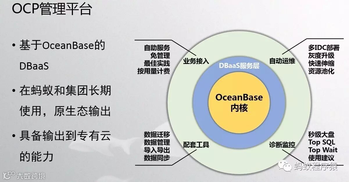 刚才说的是OceanBase的一些内核的特性,作为一个完整的产品形态,OceanBase还包括一个功能非常强大的管理和运维平台OCP。