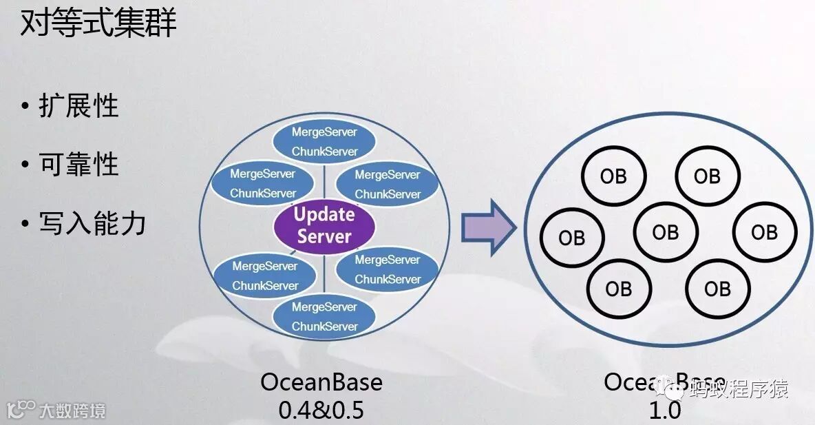 我前面说OceanBase是一个扩展性很好的分布式集群,但是其实了解OceanBase的同学可能知道,在早期的OceanBase场景里面,系统实际上是存在单点的。具体说就是集群当中每一个节点都可以提供读服务,但只有一个节点可以提供写服务,有点像传统的读写分离的设计。这是早期性的选择,这个架构的问题是,系统的可靠性和扩展性是单点的,业务写入能力的提升依靠垂直扩展,所以在OceanBase的1.0当中我们首先就解决了这个问题,真正实现了全对等的集群。在目前集群当中,所有的节点都可以提供读写服务,这就使整个系统的扩展性和可靠性有了质的飞跃。这种架构的推出也使得OceanBase的整体架构趋于稳定了,这一点非常重要,这就使得OceanBase在接下来的产品和技术这边能够加快发展奠定了很重要的基础。