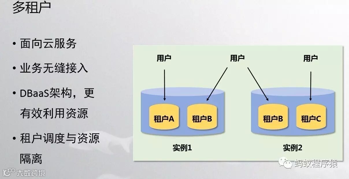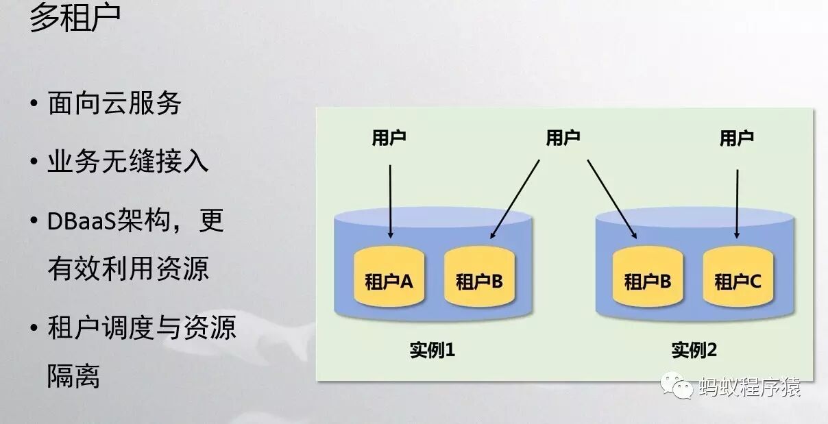 OceanBase1.0支持的另外一个重要特性是多租户。这个特性的推出,也正式宣告OceanBase成为一款云数据库产品,能够对外提供云服务,并支持业务上云。OceanBase对于多租户的支持是系统在内核层面的原生支持,我们叫做SaaS或者DBaaS架构。我们看到目前Oracle最新版本推出的多租户也是基于这个架构,而目前我们在市场上看到的大部分的云数据库产品,都是基于在不同数据库实例之间进行隔离的这样一种IaaS架构。OceanBase这种原生支持的架构与IaaS架构相比,它能够实现底层资源在不同租户间的共享,从而提高硬件的利用率,改善集群的部署的密度,同时多租户的资源隔离的特性也大大加强了产品在整个的资源的整合,包括系统化运维方面的能力。