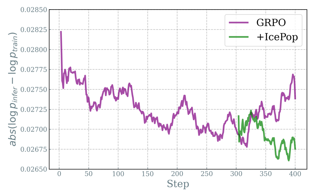 在 MoE 模型的强化学习训练中,训练和推理引擎之间的算子实现差异比 Dense 模型更显著,尤其是在生成长序列和长周期训练时,这种差异会随着序列长度和训练步数的增加而逐渐拉大。从下图的实验可以看出,在较少的训练步数内,原始的 GRPO 算法会开始崩溃,而百灵团队提出的 icepop(棒冰)算法通过带掩码的双向截断技术来修正分布,有效减小训练与推理阶段的差异,为急剧上升的训推差异“降温”。