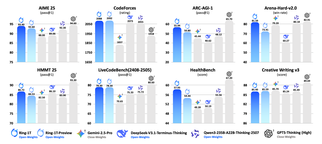 为评估 Ring-1T 的深度思考能力,蚂蚁百灵团队选取了具有代表性的开源思考模型(Ring-1T-preview、DeepSeek-V3.1-Terminus-Thinking、Qwen-235B-A22B-Thinking-2507)和闭源 API (Gemini-2.5-pro 以及 GPT-5-Thinking(High))作为参考。首先,相比于此前开源的 preview 版本,Ring-1T 在各项任务上表现更均衡。此外,Ring-1T 在数学竞赛(AIME 25、HMMT 25),代码生成(LiveCodeBench、CodeForce),逻辑推理(ARC-AGI-1)等高难推理基准上达到了开源领先水平;而在综合任务(Arena-Hard-v2.0),医疗健康(HealthBench),创意写作(Creative Writing v3)上也表现出很强的竞争力。