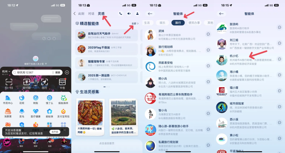 ❸ 支付宝首页下拉-【灵感】-【旅行】-【杭小忆】,点击【杭州宇宙】即刻体验。