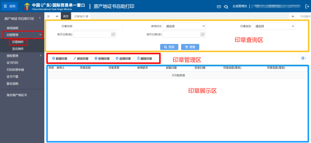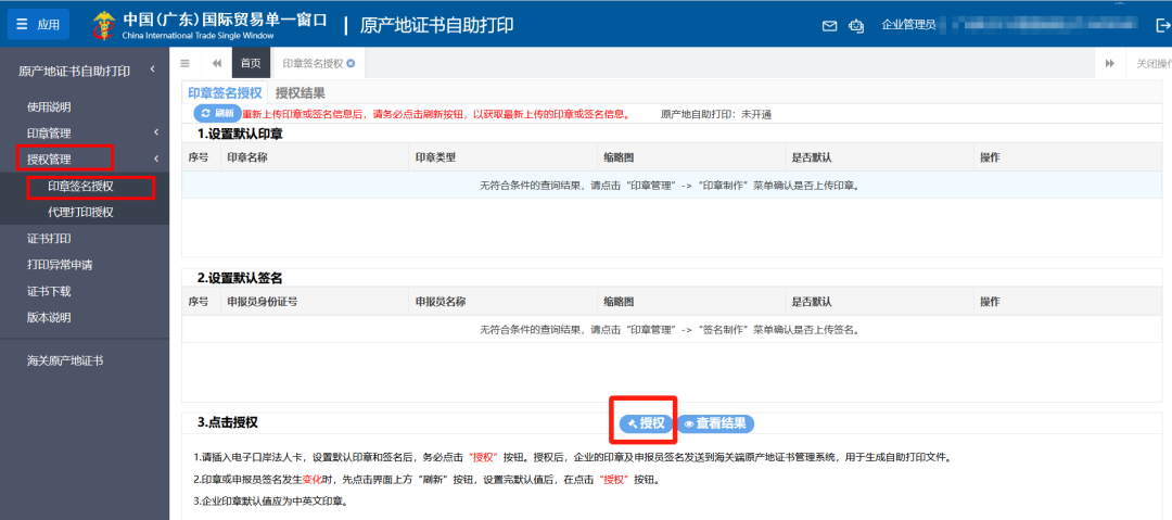 上传申请人印章及申报员签名笔迹,并对印章、签名进行授权。(适用首次自助打印,非首次的进行下一步)