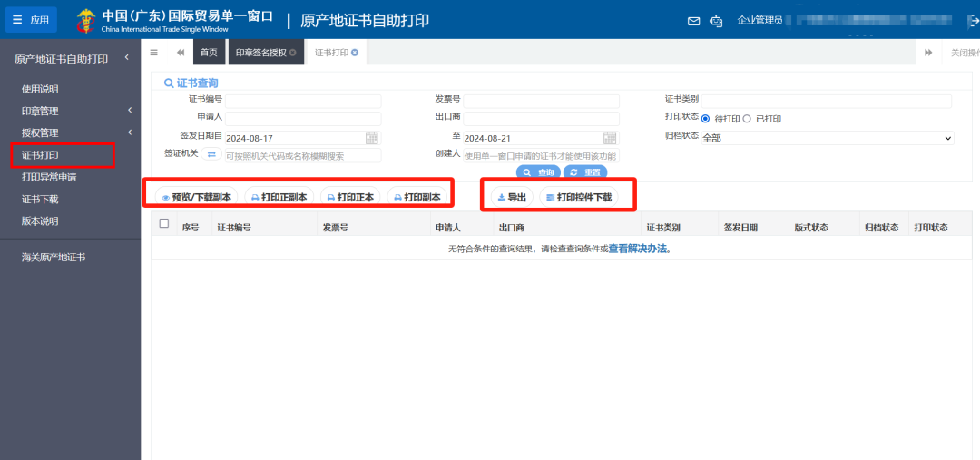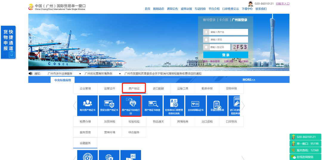 使用用户名、密码或卡介质登录,进入原产地证书自助打印系统。