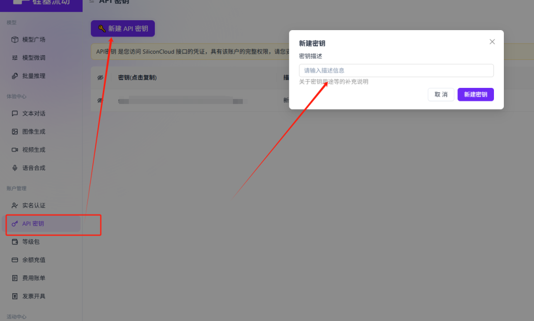 1️⃣ 获取免费 API Key: 前往硅基 AI 获取免费 API Key: