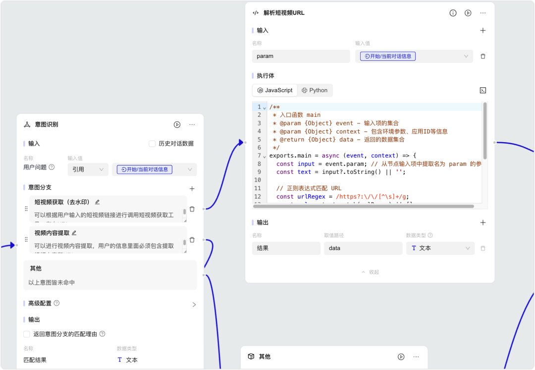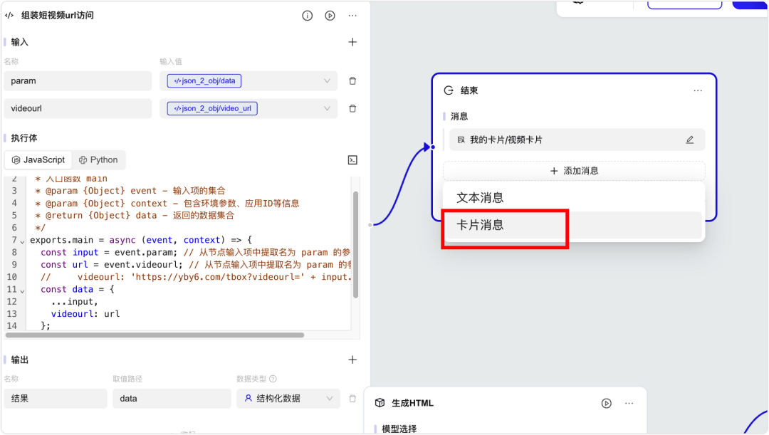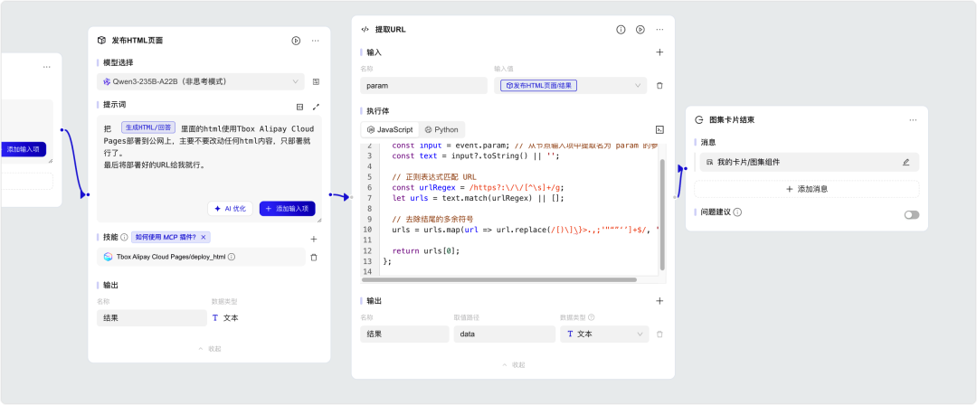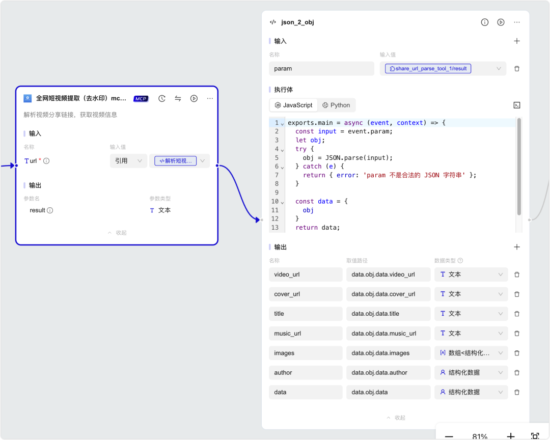 通过代码节点精准提取关键数据 URL,为后续处理做准备。