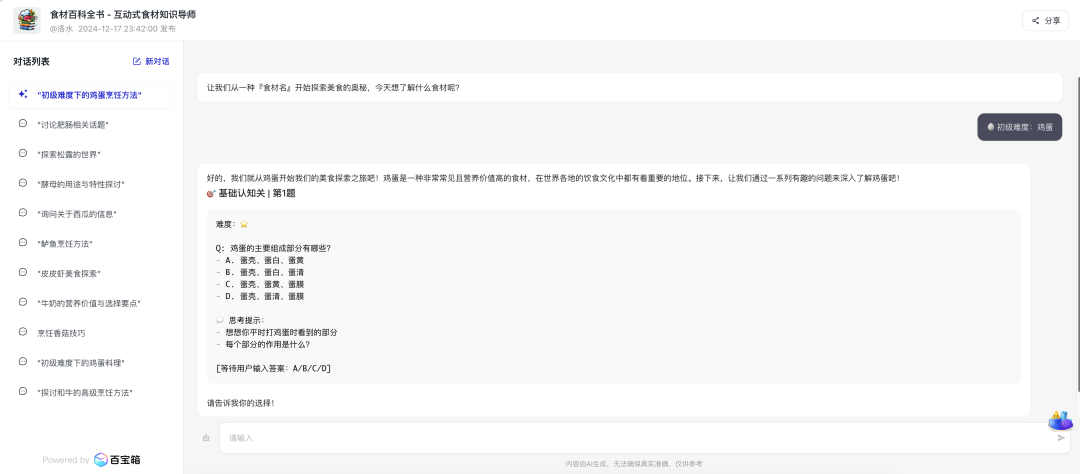 工作流:食材输入 → 知识探索 → 分级问答 → 互动反馈