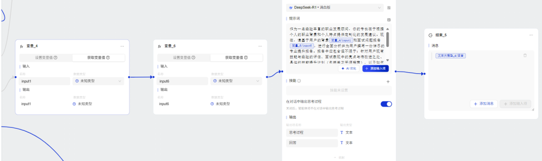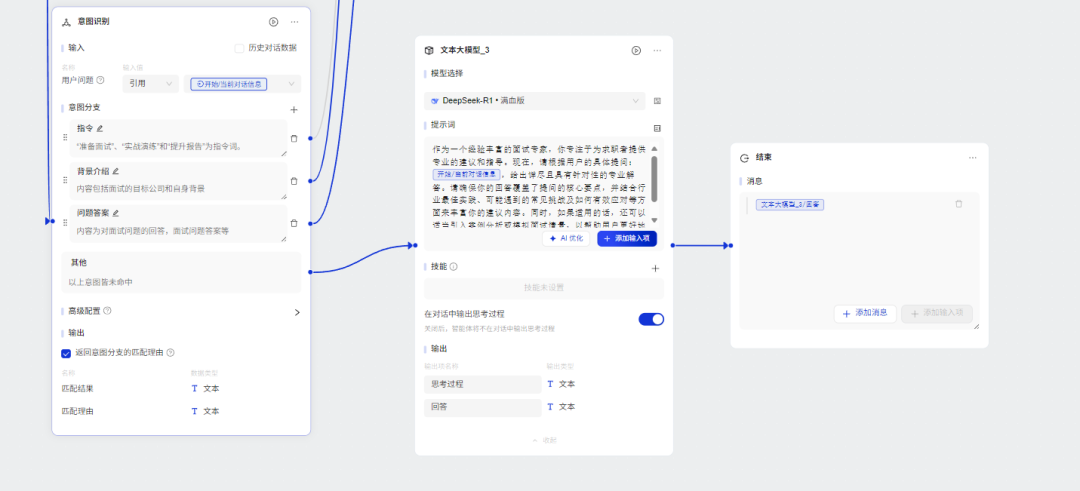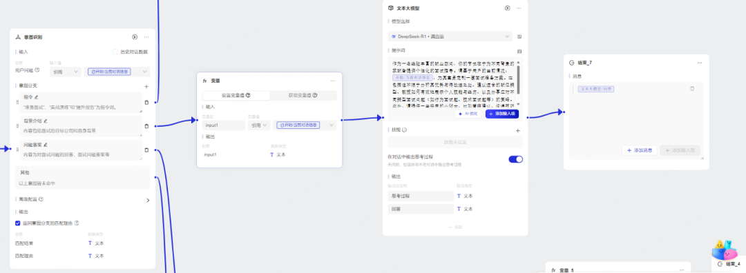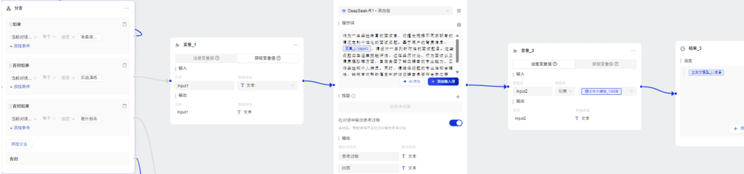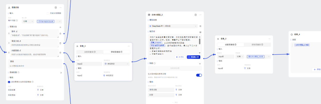 这次搭建主要运用到了百宝箱的意图识别模块,变量模块,判断节点,和 R1 大模型,核心是工作流的编排,与传统的提示词为重点有所不同,这也是 R1 模型的一个很大的提升点,当然提示词工程的重要性不言而喻。