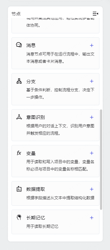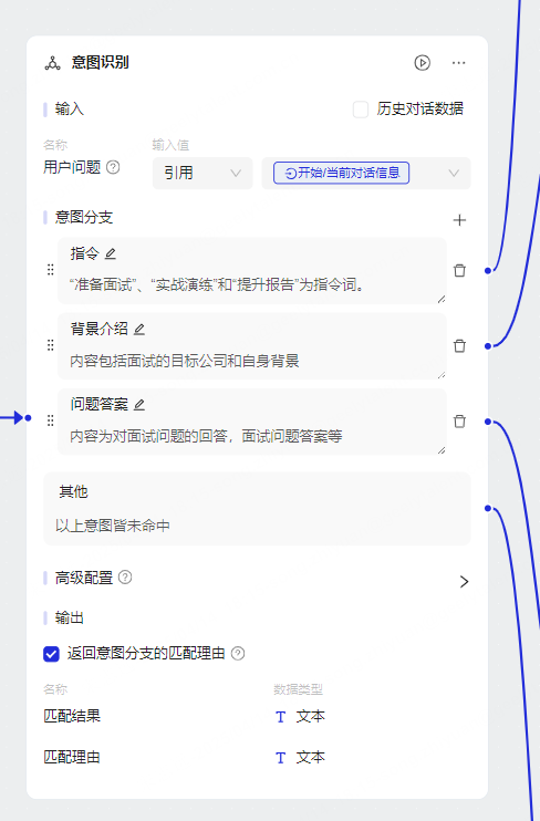 所以当用户点击对应的指令后,智能体要识别用户动作,进入到对应功能的大模型进行处理,那么在这里我们就要调用节点中的意图识别模块来帮助我们来识别用户动作。