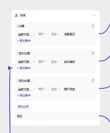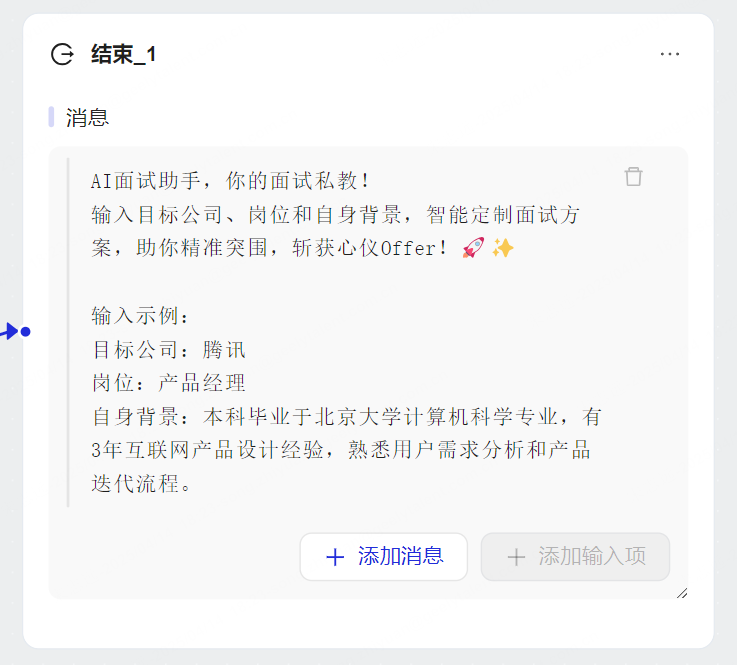 所以这里有三个判断点,如果用户输入的是准备面试,那么将立即返回一个消息,让用户提供信息,并且给出了输入示例,因为本次的用户回复是所有的分析基础数据,只有得到用户的准确信息,才能够做出针对性的处理。