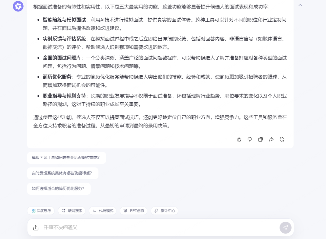 在关注到第五期的活动后,首先去详细了解了本次的活动要求,本期主题主要是探索 Deepseek 模型下智能体在生活及工作助理、娱乐游戏等各个方向的创意应用,官方也给出了每个方向的一些案例提示,这让我瞬间头脑爆炸,因为在 Deepseek 模型的加持下,好多日常的需求都值得被 agent 赋能,并且结合 deepseek-R1 的模型推理优势来看,一些重逻辑、强流程的需求是最好的选择,那么我的小脑飞速运转,想到了留学选择、职业规划、应聘面试等几个方向作为我的备选题目,经过与千问大模型和 deepseek 多轮讨论后,最终确定了本次的选题,也就是面试陪练助手。