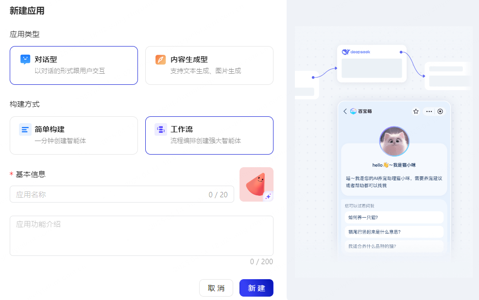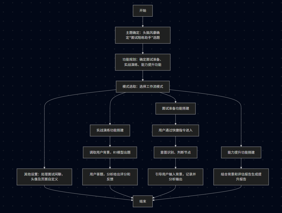 进入搭建环节,我们就要开始专业化流程,首先确定整体框架,对话模式还是工作流模式,基于面试流程的复杂性和模块化的特点,最终选择了工作流模式。
