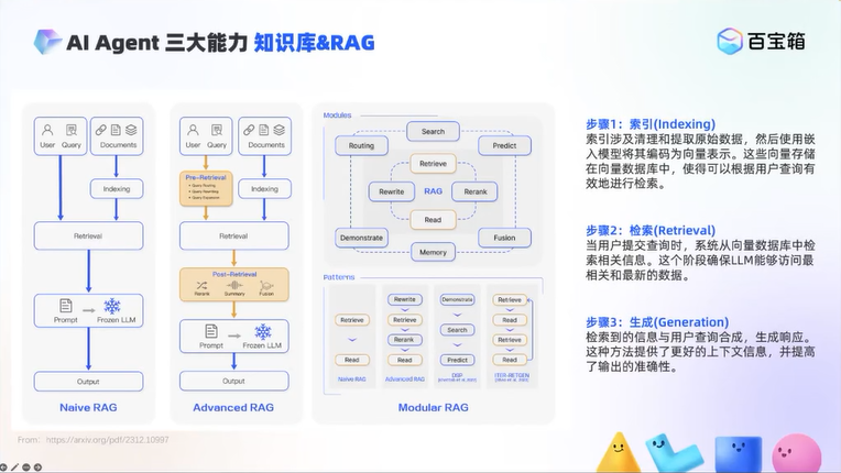 因此,我们为大语言模型设计外挂知识库的主要目的是弥补其在私域知识和实时知识获取能力上的不足。在介绍知识库能力时,我们又不得不提到 RAG(Retrieval-Augmented Generation),这是一项核心技术,专门用于实现知识库的扩展功能。RAG 的具体过程分为三个步骤,旨在帮助大语言模型通过知识扩充生成更精准的回答。