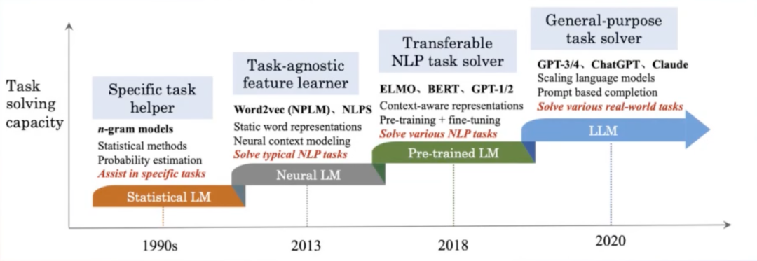到 2013 年,NLP 技术开始向任务无关的特征学习方向发展,代表性成果包括 Word2Vec 和神经概率语言模型(NPLM)。这些模型具备一定的上下文建模能力,可以解决如文本分类和信息抽取等特定任务。这一阶段的进步为后续的大语言模型奠定了基础。