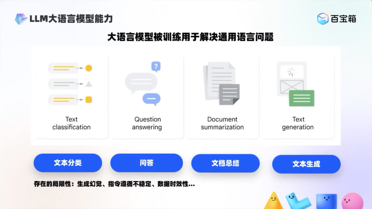 大语言模型自训练之初,便是为了解决通用语言问题。本质上,大语言模型是深层次的 API,核心功能是任务生成。从更高的维度来看,它主要具备以下四大能力: