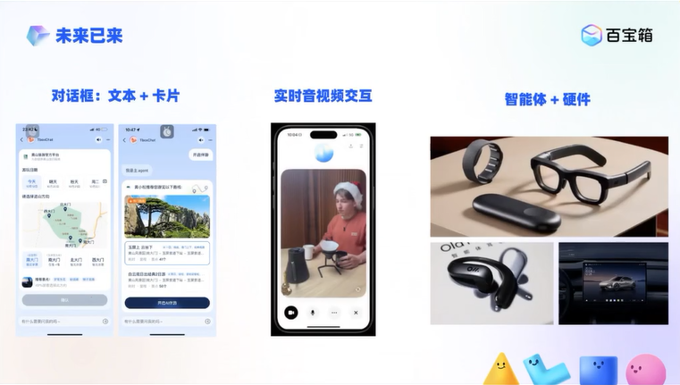 可能比较火热的一个场景就是智能眼镜这个方向,因为眼镜它对于人来说它是一个无感佩戴的过程,上面也可以装摄像头,也可以装一些语音的输入输出的一个设备。然后它可以跟手机连接,然后通过手机的计算能力去跟大模型进行交互,包括推出一些耳机场景,包括车机系统这些场景,这些都是未来,明年后年可能会大规模的应用的智能体加硬件的一些落地场景。