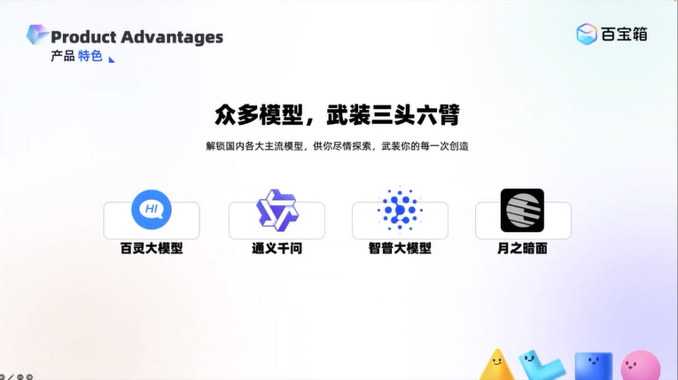 (短暂的介绍一下百宝箱~)百宝箱具备显著的特色,首先在模型能力方面,集成了多种主流大模型,包括 百灵大模型、通义千问、质谱大模型,以及 月之暗面 模型。这些模型的集成为开发者提供了丰富的选择,能够满足不同场景的需求。
