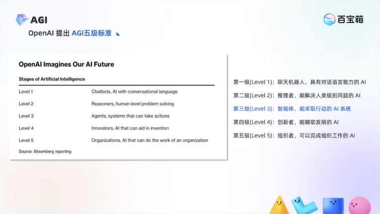 其实,这就涉及到 OpenAI 提出的通用人工智能(AGI)的五级标准。AGI 的终极目标是创造一种能够像人类一样完成各种复杂任务,同时还能自然交流的通用人工智能。根据这个定义,AGI 的发展被分成了五个等级。