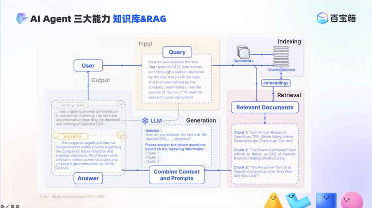 通过这一完整的流程,RAG 技术实现了知识的检索增强生成。它不仅让大语言模型能够接入私域知识,还为其增加了实时获取知识的能力。通过 Indexing、Retrieval 和 Generation 这三个关键步骤,AI Agent 可以更高效地支持各种特定场景,提升回答的准确性和实用性。