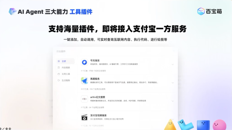 百宝箱提供了丰富的插件资源,并计划在未来集成支付宝的一方服务能力,例如发放优惠券、支付功能以及芝麻信用等。通过这些集成功能,百宝箱可以支持实时执行插件任务,自动调用外部服务,并实现诸如互联网接口查询、代码执行、绘图以及高德地图搜索等功能。这些插件的交互界面设计直观便捷,用户可以轻松上手操作。
