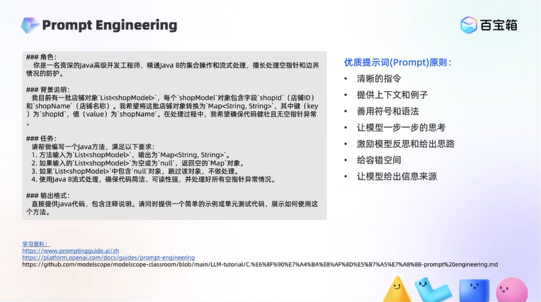图中左侧示例展示了一个实际的 Prompt 设计案例。在这个例子中,模型被定义为一名 Java 高级开发工程师,任务是对一组 shopModel 数据进行处理,并生成符合要求的 Map 数据结构。这个设计包含了角色说明、任务描述、具体要求以及明确的输出格式。