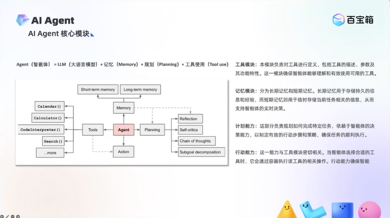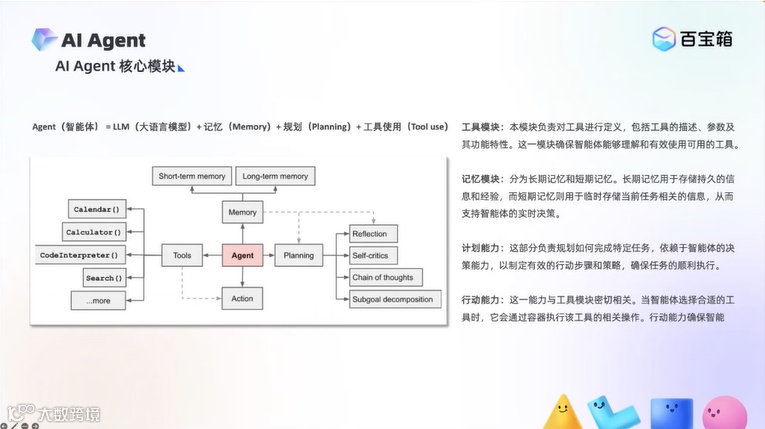 这张图从去年起就出现了,它非常清晰地定义了 AI Agent 本身。接下来我们聊聊智能体本身的几大核心能力。
