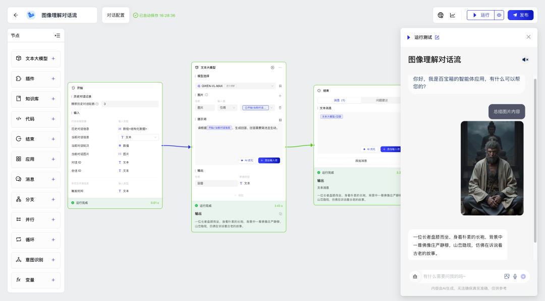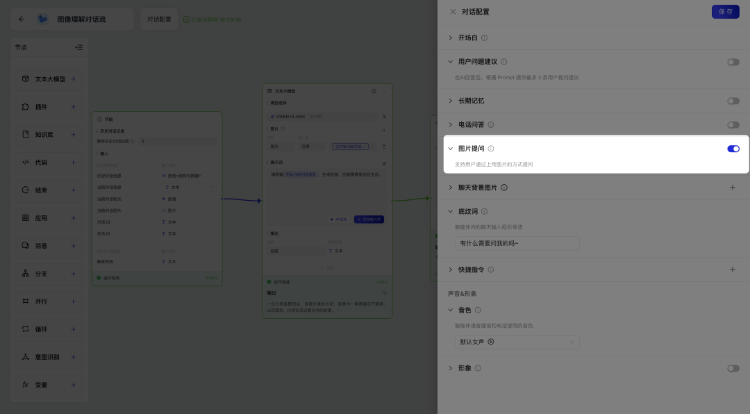 工作流对话模式下,支持图片上传。大模型节点新增视觉模型(通义千问 VL模型)的选择项,可支持图像理解等场景。