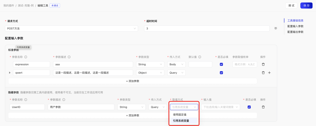 在创建自定义插件时,可添加隐藏参数(隐藏参数仅限工具内部使用,使用者不可见),从而支持固定值和引用系统变量。
