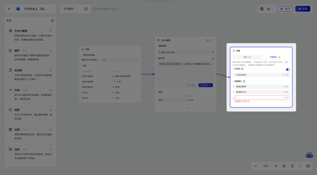 结束节点支持自定义引导词和问题建议,目前最多支持三条问题建议,可以自定义排序。