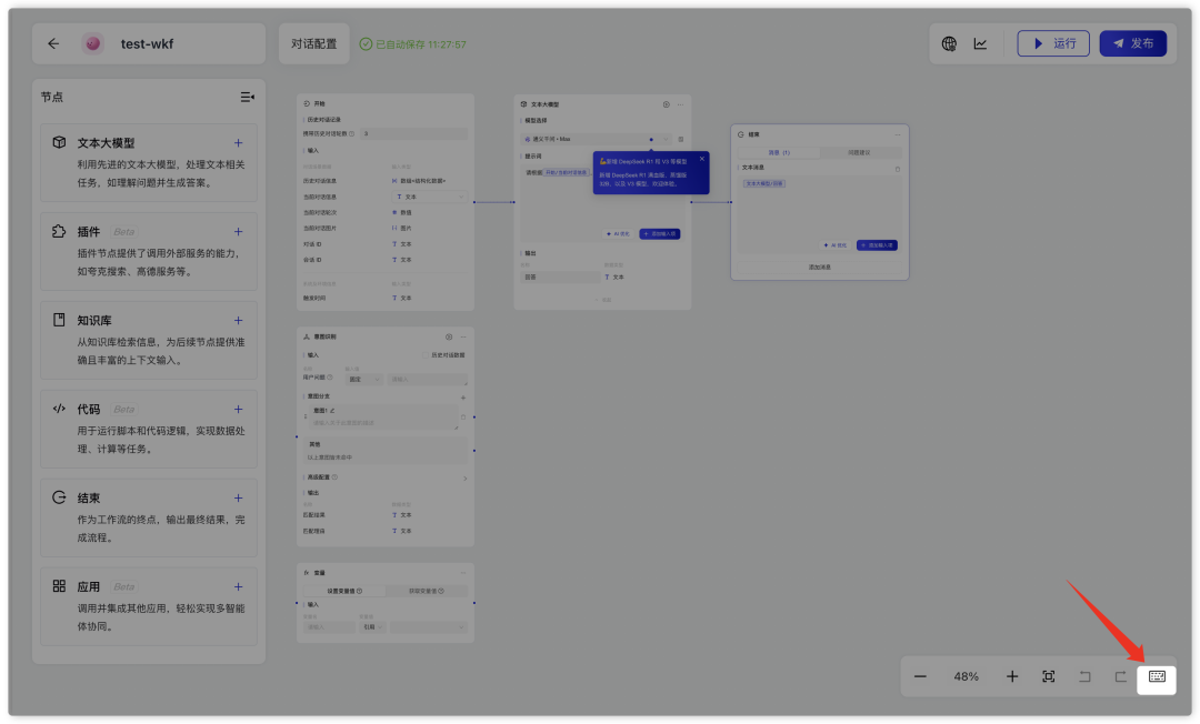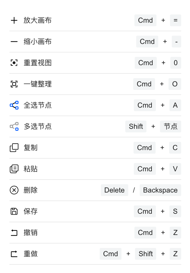 已开放画布快捷键操作,包括「放大」、「缩小」、「一键整理」等,点击右下角【⌨️】按钮查看所有快捷键。