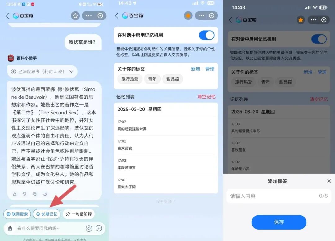 如果对 AI 总结的 “关于你的标签”不太满意,点击【长期记忆】,可以删除标签,也支持添加个性化的标签。