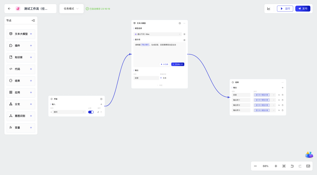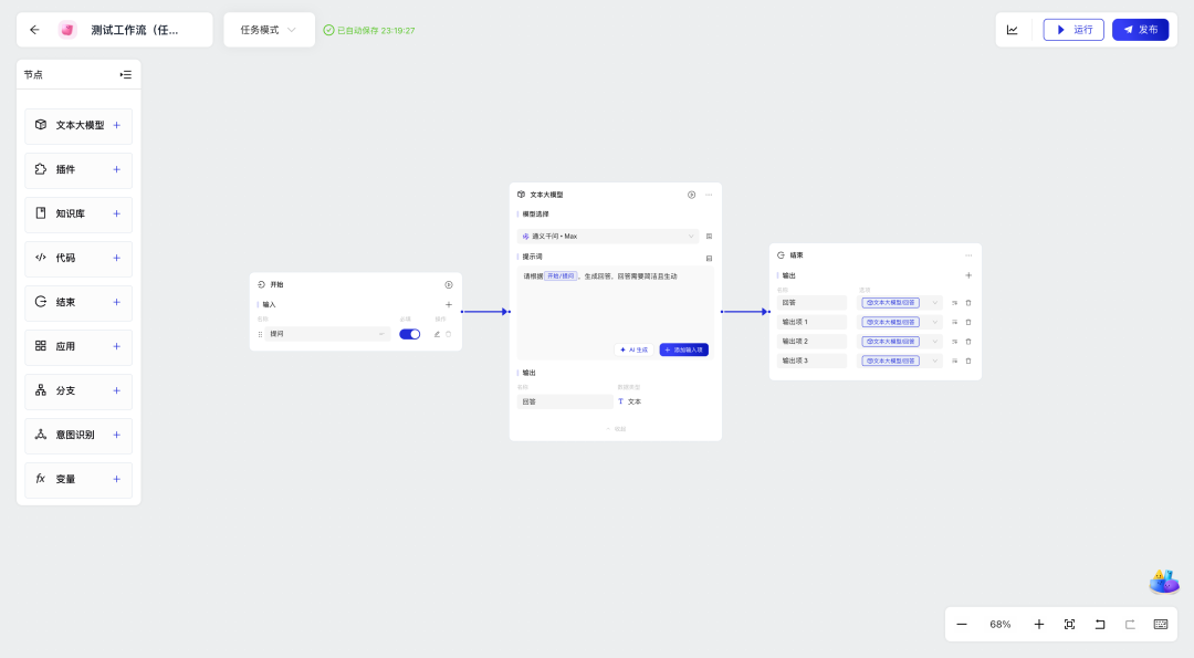 满足流式协议的工具被调用时,可输出多个内容片段,通过逐段动态显示,实现流式输出效果。当前支持 String 类型的输出参数字段在工作流中流式输出。