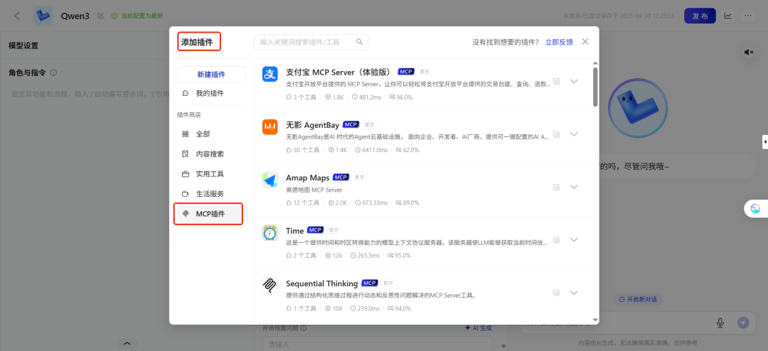 蚂蚁百宝箱内置丰富 MCP 插件库(如支付宝支付、高德地图、无影、夸克等),开发者只需点击「添加插件」处添加对应 MCP 插件,Qwen3 即可自动识别用户需求场景,比如检测到 “规划/预定行程” 时,无需手动配置,模型会自主激活淘票票查询、调用高德地图规划路线、串联支付宝完成支付,全流程智能调度。且资源池支持无限量调用,高频对接金融数据 API、实时天气接口等场景时,无需担心配额限制,真正实现 “量大管饱” 的工具自由。