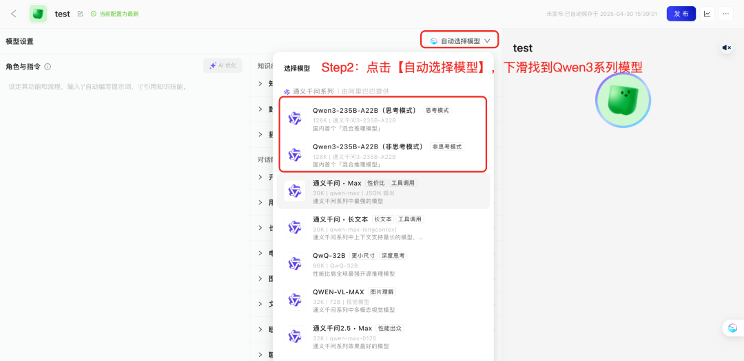 ❷ 点击「自动选择模型」,下滑找到 Qwen3 系列模型,即可立即体验。
