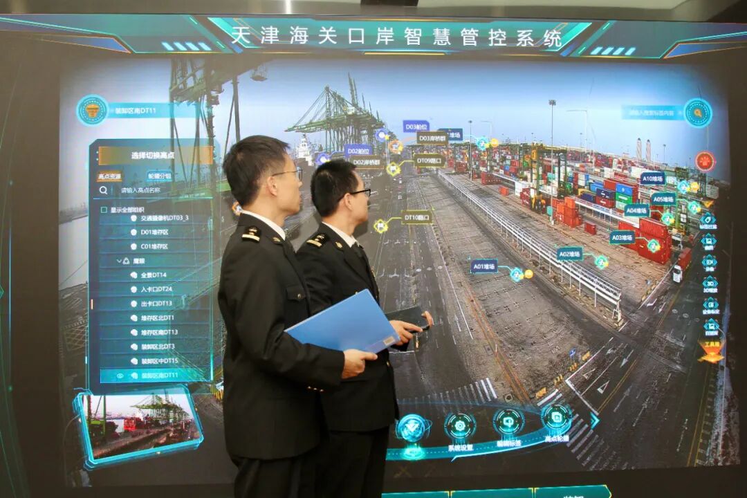 1月23 日,天津海关所属东疆海关关员通过口岸智慧管控系统对船舶靠泊、装卸作业、场位堆存等场景进行实时管控。2023年,天津东疆海关累计应用智慧管控系统监控内贸船舶作业1736艘次、227万标箱,东疆港区内贸作业箱量较上一年度增长超一倍。