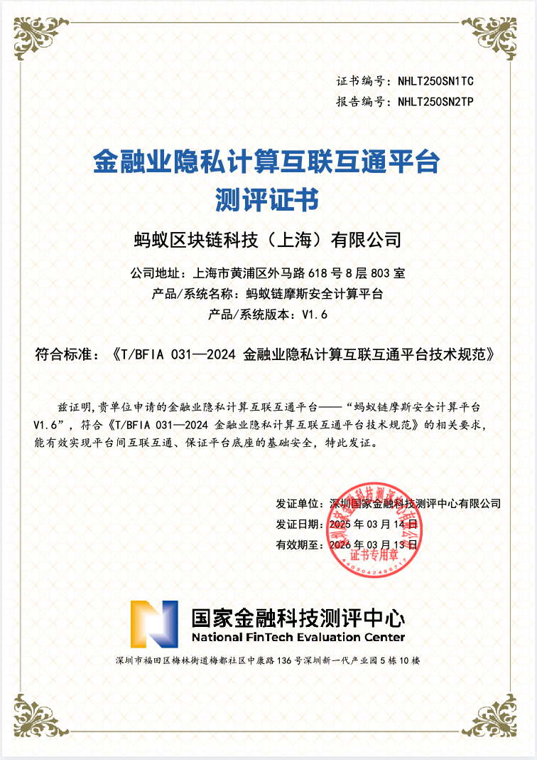 最近,在由北京金融科技产业联盟组织的隐私计算平台互联互通测评认证中,蚂蚁数科和中国银联成为首批通过标准检测的厂商。