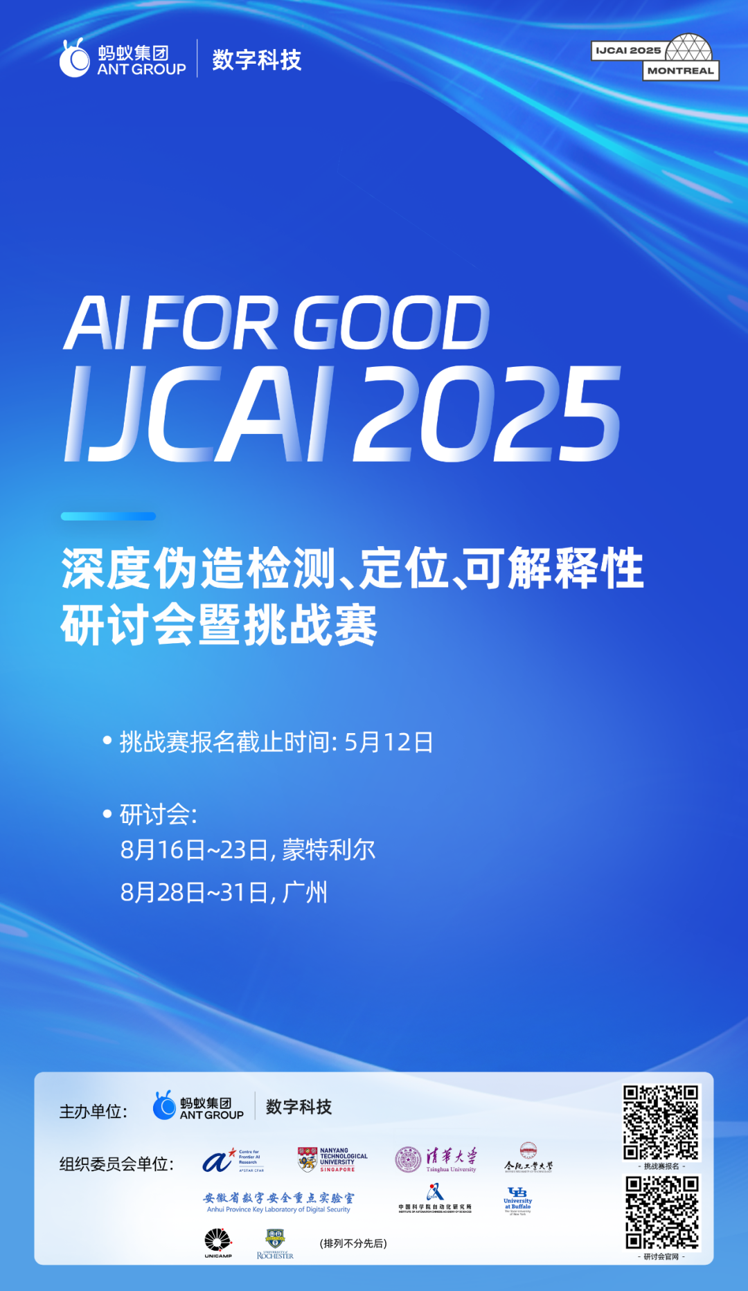 为应对生成式AI快速发展带来的新型安全挑战,蚂蚁数科联合新加坡科技研究局人工智能前沿研究中心,南洋理工大学,清华大学,中科院自动化所,合肥工业大学,安徽省数字安全重点实验室等多家机构,在国际顶级学术会议IJCAI 2025上举办“深度伪造检测、定位、可解释性”学术研讨会暨挑战赛, 致力于构建可信赖的AI内容安全生态。