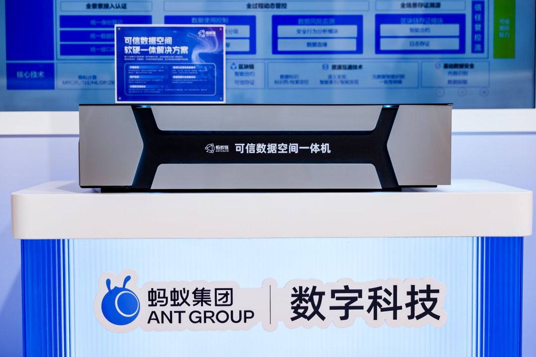 蚂蚁数科的解决方案将区块链、隐私计算、数据脱敏等技术封装为软硬一体机,预装全栈软件,以“开箱即用”的产品特性,帮助企业快速建立或接入数据空间,部署时间较传统模式缩短90%。