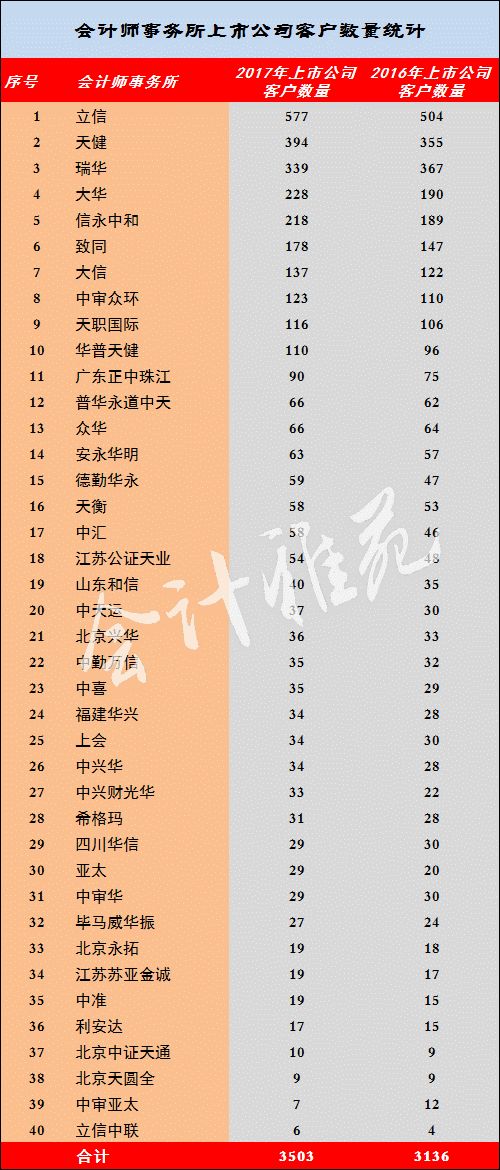 截至2018年4月30日,40家证券资格会计师事务所共为3503家上市公司出具了财务报表审计报告,其中,沪市主板1407家,深市主板472家,中小企业板907家,创业板717家。从审计报告意见类型看,3450家上市公司被出具了无保留意见审计报告,36家被出具了保留意见的审计报告,17家被出具了无法表示意见的审计报告。