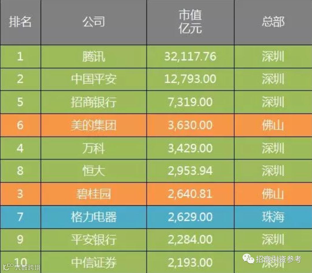 图2:2017年广东上市公司市值前十强(统计时间截止2017年12月,数据来源同花顺)