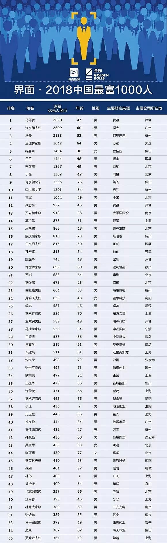 导读:2018年1月29日,北京——界面重磅推出“2018中国最富1000人”榜单。