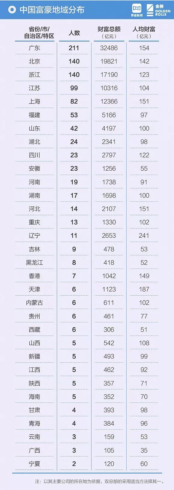 从地域上看,上榜富豪覆盖了31个省级行政区以及中国香港特区,广东省的富豪数量和财富总值双第一,有211位富豪上榜,累计财富值32486亿元,占榜单总财富的25.9%。接着是北京和浙江,各有140位富豪上榜。