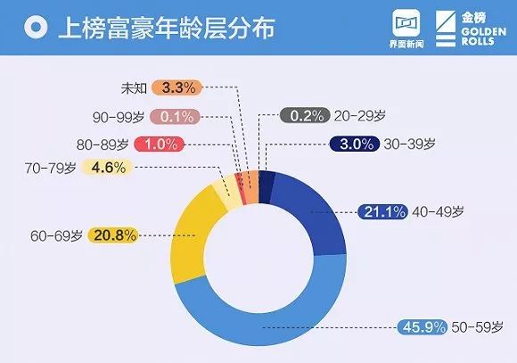 本次上榜的1000位富豪,平均年龄55岁。最年轻的是ofo戴威(27岁),最年长的一位是生益科技的唐翔千(95岁)。年龄在50-59岁的富豪属于富豪榜中坚力量,共有459位,几乎占去半壁江山。